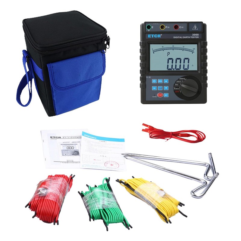 Accessories: ETCR3000 Digital Earth Resistance Meter: 1PC; Earth Rod: 2PCS; Testing Wire: 3PCS; Simple testing wire: 2PCS; Tester bag: 1PCS; Alkaline dry battery LR14 1.5V: 6 PCS