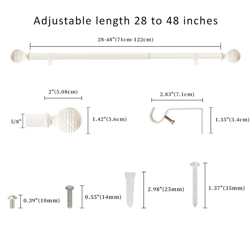 eTeckram 5/8" Single Curtain Rod with Boule Finials (Weathered White, 28''-48'')