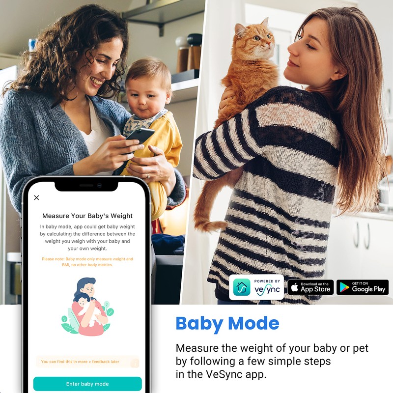 - Baby Mode: Measure the weight of your baby or pet by using Baby Mode in the VeSync app
