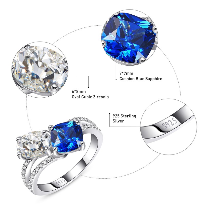 - Gemstone Combination: The ring features a captivating combination of gemstones, specifically a 4-prong 6x8mm Oval Cubic Zirconia paired with a 4-prong 7*7mm Cushion Blue Sapphire Pave Setting 1.2mm Cubic Zirconia. This combination not only creates a mesmerizing visual contrast but also adds to the overall elegance of the piece.
