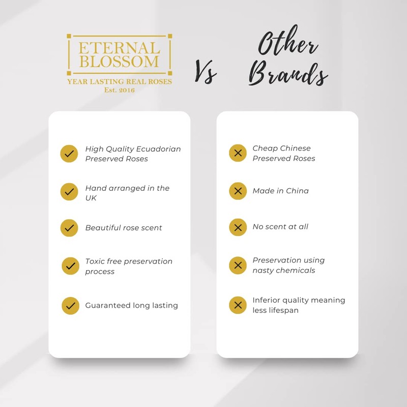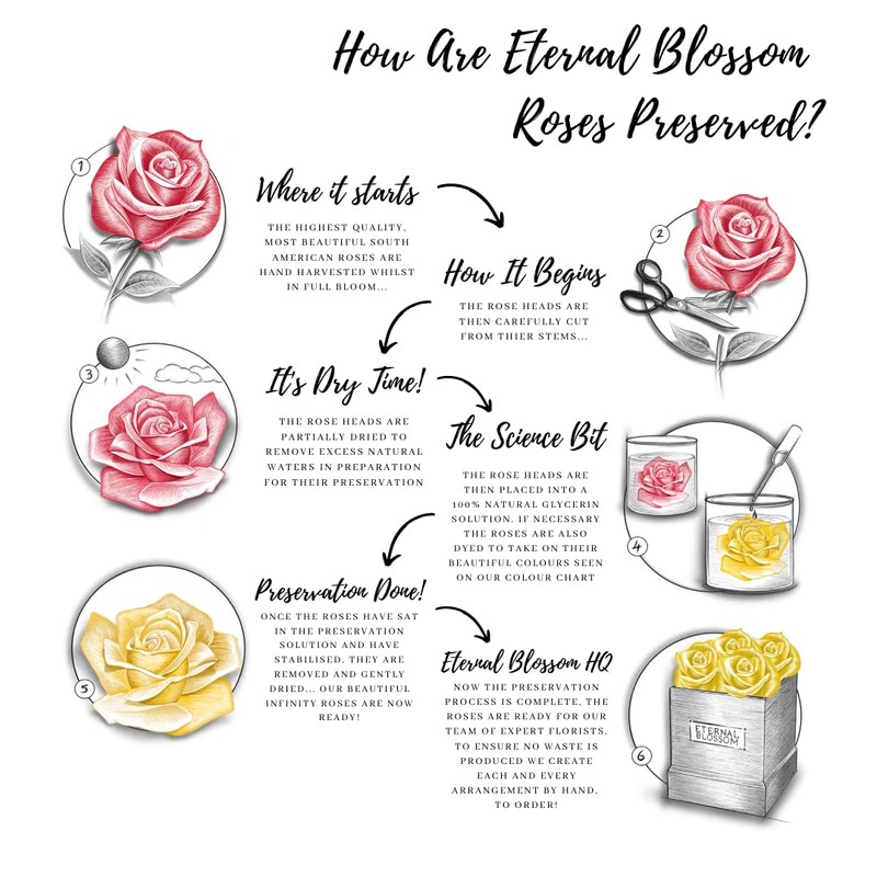 - 🌹 HIGH QUALITY GUARANTEED 🌹 We use only the highest-quality, hand-selected Ecuadorian roses in our arrangements. Each rose is carefully preserved using a special toxic free process that maintains its shape and colour for years to come. We never use any of the cheap Chinese preserved roses you see in other arrangements.