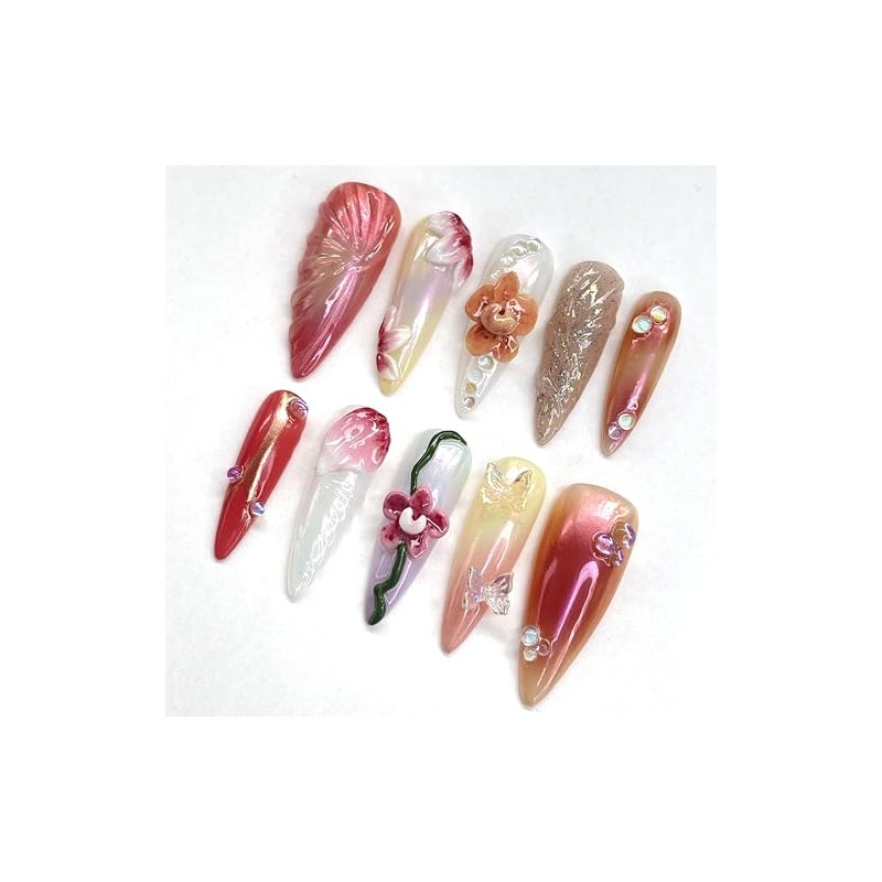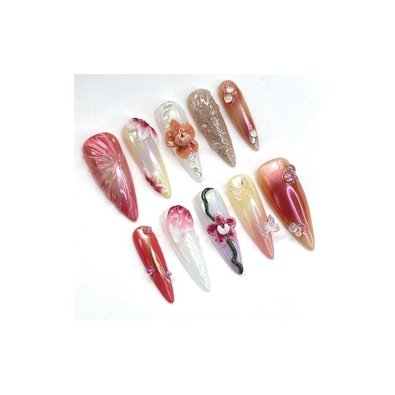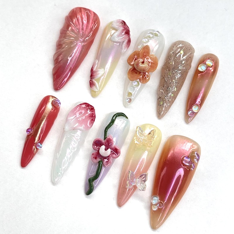 • Handmade 3D Press-On Nails That Feel Like Art: These aren’t your typical press-ons. Every nail is hand-sculpted with real 3D flowers and butterflies, finished with a glossy UV coat to keep them looking fresh and fabulous. It’s like wearing a tiny work of art on your fingertips.