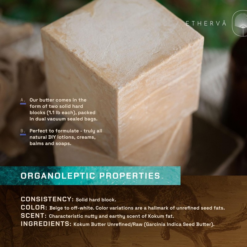 ETHERVA Raw Kokum Butter | Unrefined, Non-Deodorized, Unbleached | Wild Grown Organic Seeds | Bulk DIY Soap Making | Moisturizer for Skin, Body & Hair | Fatty Acids, Antioxidants | 2.2 lb