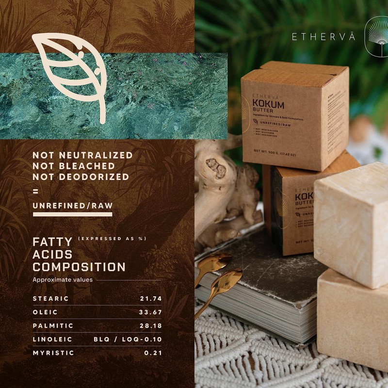 - 🌿 Why Is It Expensive?: Traditional physical extraction yields only about 25% of Unrefined Kokum Butter. On the other hand, the use of chemical solvents in the extraction process increases the yield to as high as 44%. The resulting chemically refined butter is less expensive. DIY products which solely harness our truly unrefined Kokum Butter can be classified as natural, pure, unbleached, non-deodorized & non-neutralised.