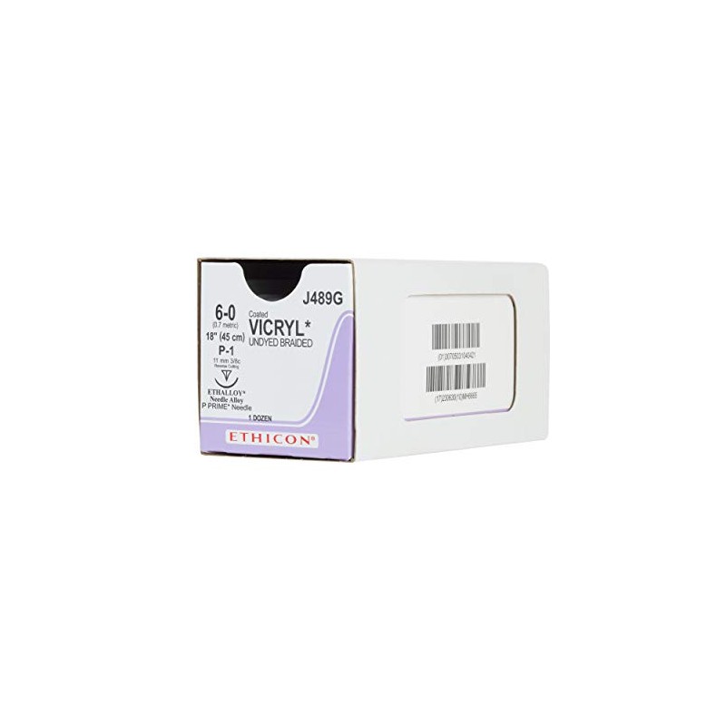 Ethicon Coated VICRYL (Polyglactin 910) Suture, J489G, Synthetic Absorbable, P-1 (11 mm), 3/8 Circle Needle, Size 6-0, 18" (45 cm)