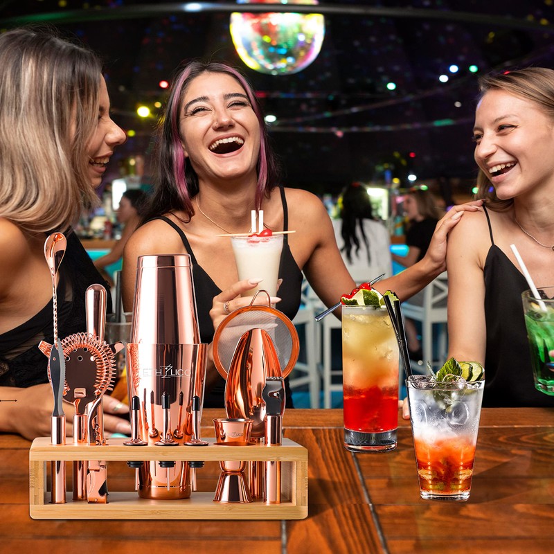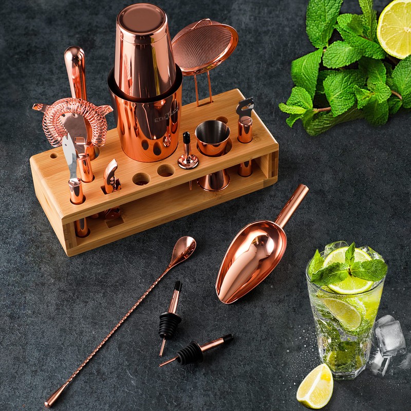 - MASTER IN MIXOLOGY: Our premium bartending supplies are perfect for both aspiring bartenders wanting to upgrade their after-dinner drinks or seasoned mixologists that love crafting original concoctions. The elegant bamboo storage rack and sleek Rosegold stainless steel tools compliment any bartop or bar cart. The perfect housewarming or holiday gift for any cocktail lover with a hardcover cocktail book with 55 drinks ranging from timeless classics to contemporary party favorites.