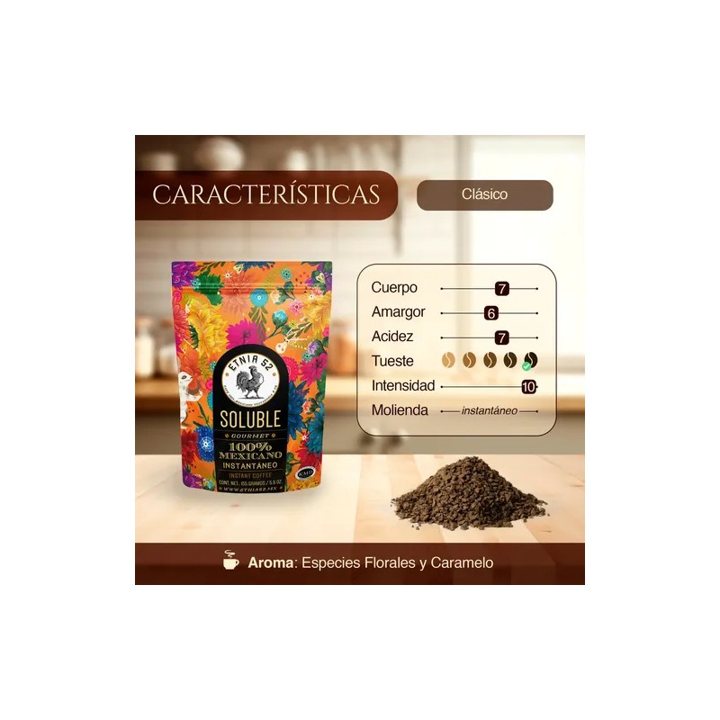 ETNIA 52 Café Soluble Clásico Instantaneo y Aglomerado | 155g | Aroma y Gusto Firme | Balance en Amargor y Acidez | Sin azúcares añadidos | 100% Mexicano | Certificación Kosher | Café Soluble