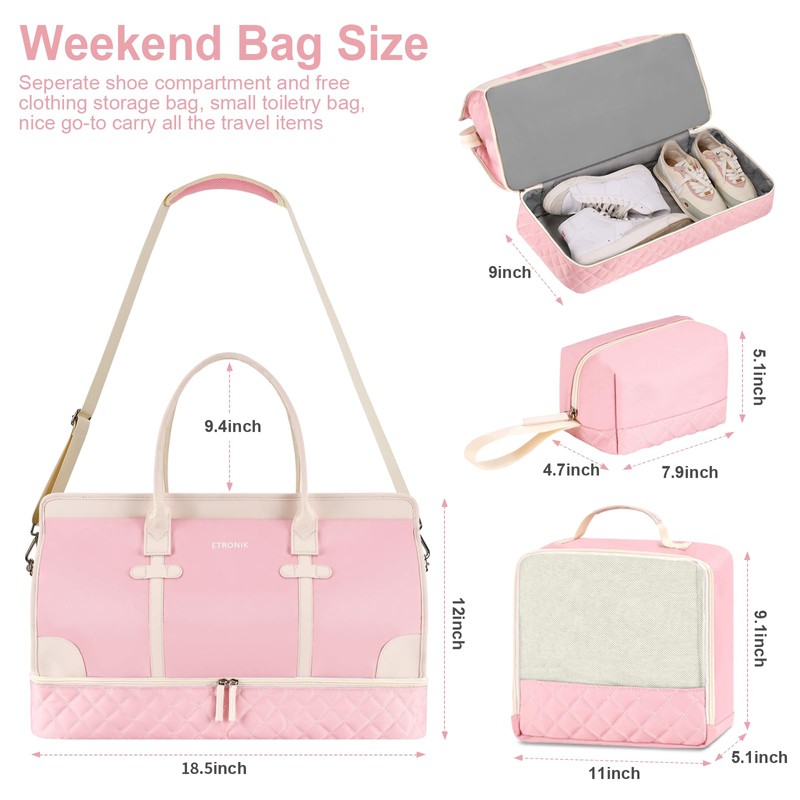 - Upgraded 3 Pcs Set: The travel bag comes with 1 weekender bags for women to help you organize and maximize your space when traveling. 1 clothing storage bag to help sort, organize, and locate clothes quickly.1 toiletry bag to store your cosmetics and toiletries. ETRONIK duffle bag for travel is made of thick and resistant materials, providing a comfortable carrying experience