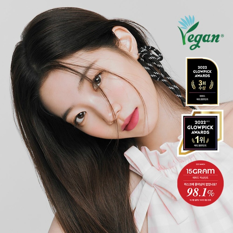 Hydro-matte tint that fixes comfortably like water. Vegan certified, ranked no.1 in the 2022 Glowpick Awards, and a 3-time winner of the 2022 Glowpick Awards. Certified by the Korean Vegan Services and it is a tightly fixing product. Naver Beauty Window's makeup has been ranked no.1 for 10 consecutive weeks as the fixing tint, which sold more than 4 million units. According to a Glammer survey, 98.1% of users reported no smudging, 99.5% experienced no stickiness, and 99.9% deemed it suitable for daily use as a color. Additionally, the product showed strong ratings for endurance at 97.5%, coloration at 99.4%, adhesion at 99.3%, and repurchase at 98.7%. According to real reviews, it is a product that has almost no residue, perfect triplets, and excellent elasticity. The hydrated matte texture that fixes moisture as if it were dyed with lips. This lip tint has been tested and proven to be smudge-free after 60 seconds, even when worn under a mask.