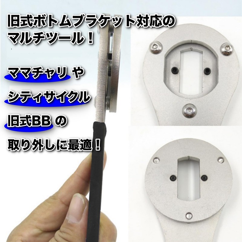 Tool for bottom bracket: This is a dedicated tool that supports mommy-chari, city cycle and old-fashioned bottom brackets. Use the front and back to remove BBs on both left and right sides.