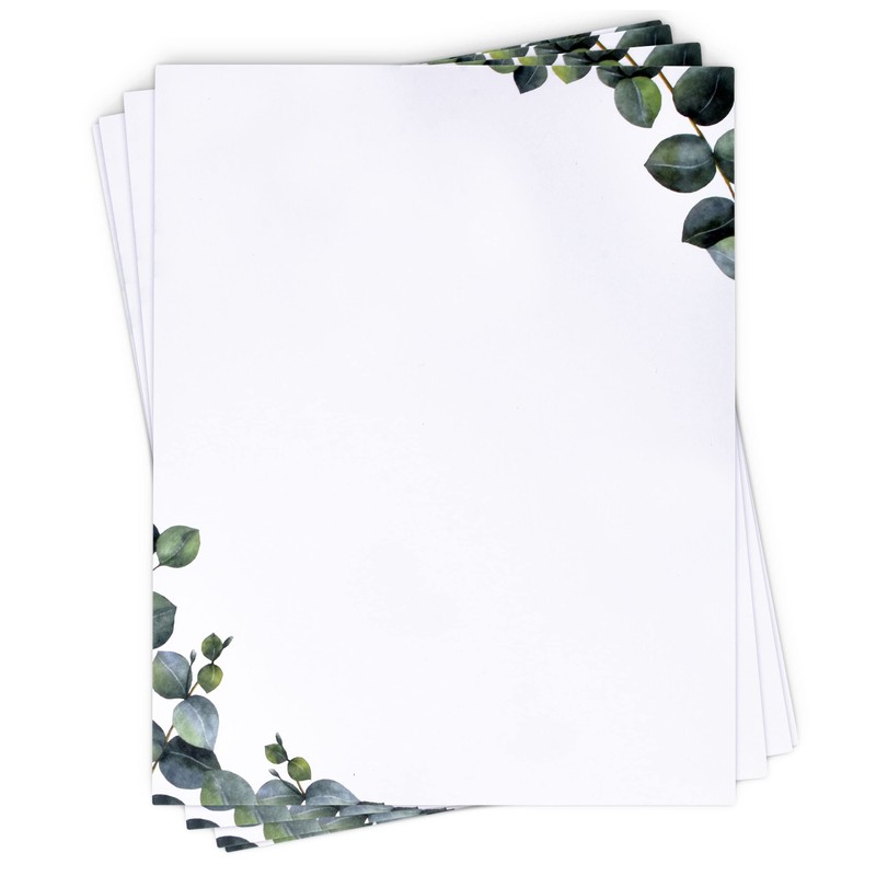 - High Quality Eucalyptus Greenery Paper- 8.5” X 11” size letter form paper. This 100 Premium thick green leaves paper set is printed on both sides of the white paper with a green leaf design on the top and bottom of the page.