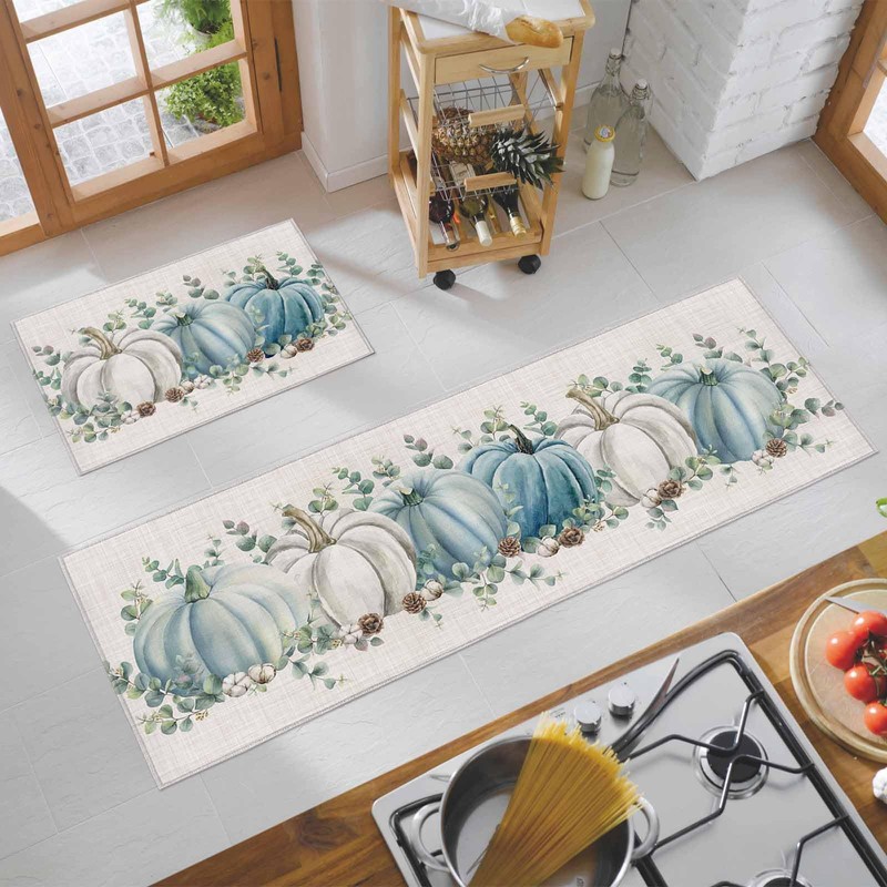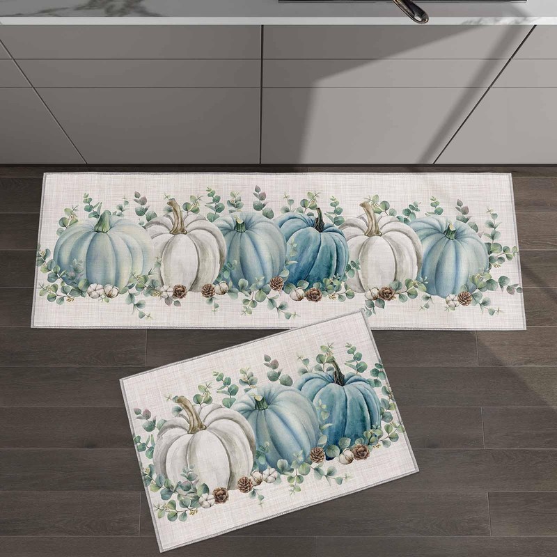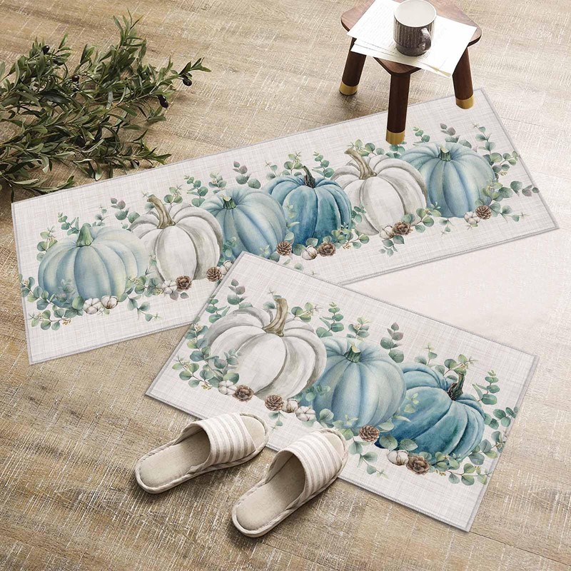 Teamery Autumn Eucalyptus Leaves Kitchen Mats for Floor Fall Pumpkins Washable Non Slip Kitchen Rugs 2PCS, Absorbent Standing Mats for Sink Bathroom Office Living Room 15.7x23.6in+15.7x47.2in
