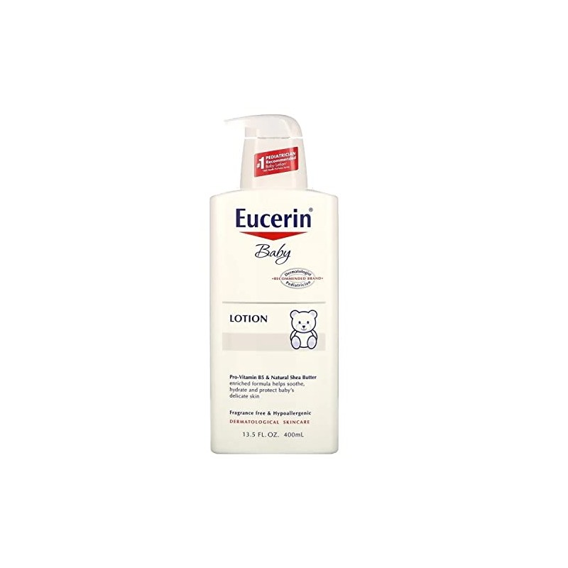 Eucerin Baby Lotion moisturizes and nourishes baby's delicate skin, helping to leave it soft, smooth and protected. This hypoallergenic baby moisturizer formula is gentle enough to use every day and is enriched with soothing ingredients like Pro-Vitamin B5 and natural Shea Butter. Eucerin unscented baby lotion sensitive skin formula is free of fragrances, parabens, dyes and drying alcohols. To use, massage Eucerin Baby moisturizing lotion daily on your baby's skin. For best results, use after your baby's bath. Eucerin Baby skin care products feature gentle formulas for baby skin care needs. Pair this baby lotion for dry skin with Eucerin Baby Wash and Shampoo as part of your baby essentials. Eucerin is a dermatologist and pediatrician recommended skin care brand that is based on an uncompromising approach to science.