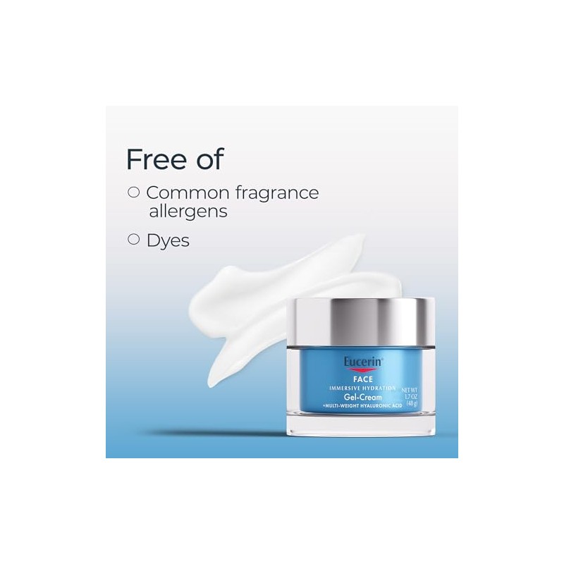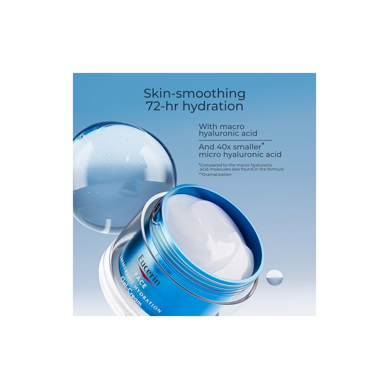 Eucerin Face Immersive Hydration Gel Cream hydrates throughout the skins surface layers for up to 72 hours with an ultra-lightweight formula. Enriched with Multi-weight Hyaluronic Acid, the clinically proven moisturizing cream formula combines two sizes of hyaluronic acid. With macro-sized molecules, this hydrating face moisturizer intensively hydrates the skins surface, while with 40x smaller(1) micro molecules, it hydrates throughout the skin's upper surface layers, helping to improve the look of fine lines and wrinkles. To support the skins smooth, hydrated appearance, this daily moisturizer cream is further enriched with an Antioxidant Complex, helping to defend against damaging free radicals. Eucerin Face Immersive Hydration Gel Cream increases moisture significantly for skin that looks fresh and healthy and feels more resilient. The non comedogenic moisturizer is formulated for all skin types, even sensitive skin, and has a skin-friendly fragrance, free of common fragrance allergens. Use this gel cream with the Eucerin Face Immersive Hydration Collection. Eucerin is a dermatologist-recommended skincare brand that is based on an uncompromising approach to science, with skin care products formulated to restore and sustain healthy-looking skin. (1)40x smaller than macro hyaluronic acid molecules also in the formula