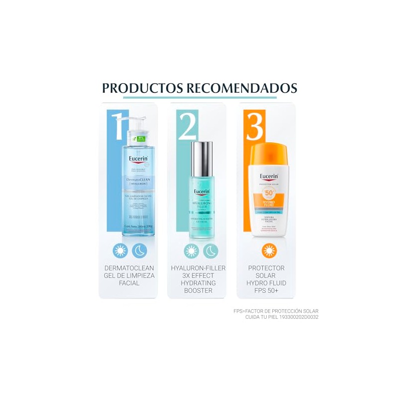 - Filler 3x Effect. Beneficios: Serum facial hidratante ultra ligero y refrescante Para todo tipo de piel, incluidas las sensibles Refuerzo inmediato de la hidratación No Comedogénico Ligeramente perfumado Se puede usar debajo del maquillaje. Este gel hidratante Hyaluron Filler Moisture Booster de Eucerin es perfecto para mantener tu piel hidratada durante 24 horas. Su textura es ligera sin ser pegajosa y es perfecto gracias a su fórmula con ácido hialurónico. Ayuda a rellenar las líneas de expresión y proporciona hidratación intensa. Perfecto para todo tipo de piel.
