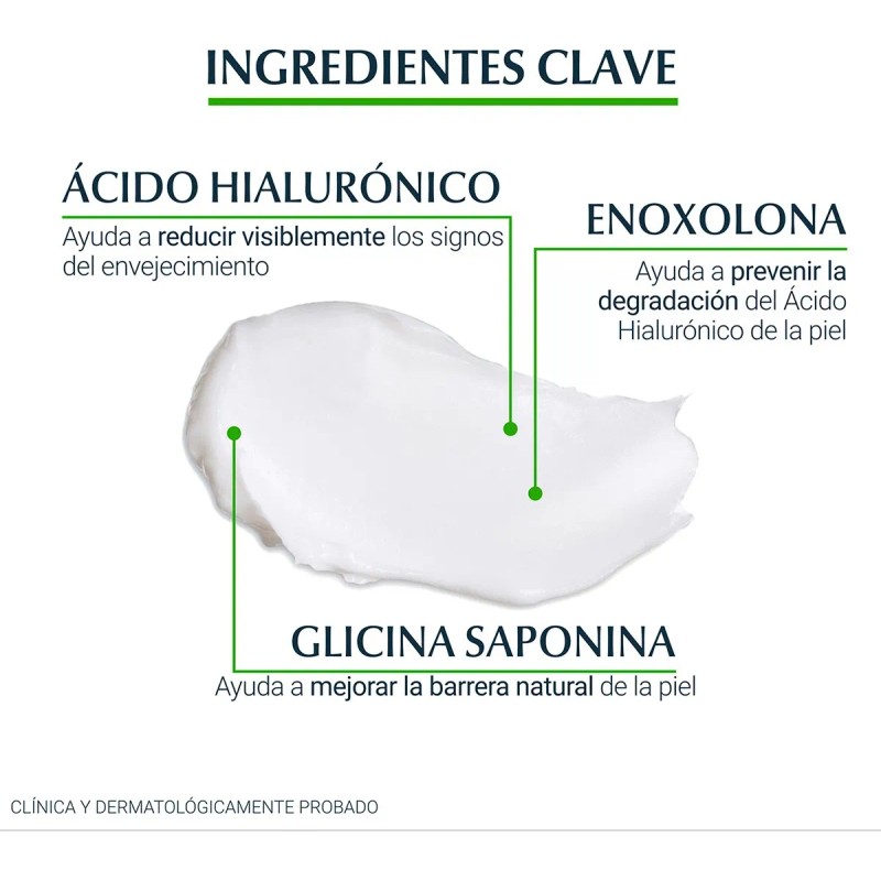 Incluye Glicina Saponina, que estimula la producción natural de ácido hialurónico, y enoxolona, que protege contra la degradación del mismo.