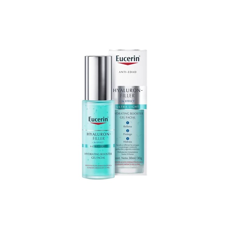 Da a tu piel un boost de hidratación inmediato con el gel antiedad Eucerin Hyaluron-Filler +3X Effect Hydrating Booster. Este gel facial ultraligero y refrescante proporciona una hidratación inmediata y aumenta los niveles de hidratación de la piel hasta 24 horas. La fórmula combina sustancias producidas naturalmente por la piel para mantenerse hidratada, como lo son el Ácido Hialurónico altamente concentrado y Glicerina. Estas funcionan como imanes de hidratación que ayudan a rellenar la piel de manera inmediata e intensa.