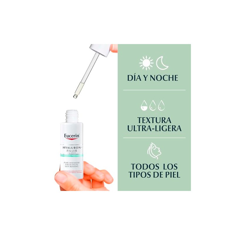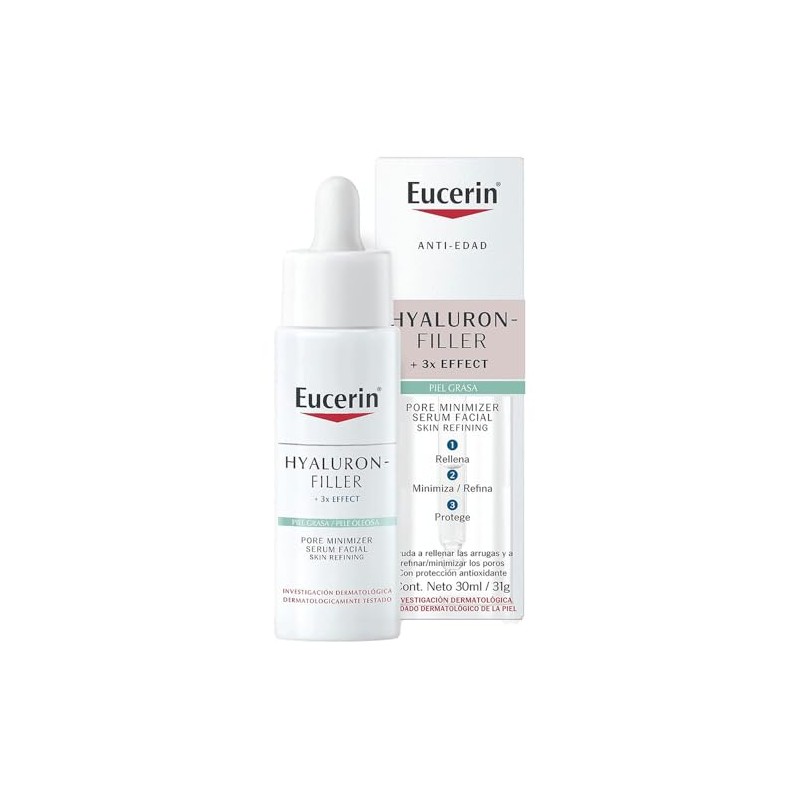 Eucerin Hyaluron-Filler + 3x Effect Serum Facial (30ml) Minimizador de poros, Rellena, Reafirma y Protege. Ayuda a rellenar arrguas con protección Antioxidante, para una piel mas lisa. Combate los primeros signos de envejecimiento y afina los poros con el nuevo serum refinador de la piel Hyaluron-Filler de Eucerin. Este serum ultraligero contiene tres activos clave, como el Ácido Hialurónico, el Ácido Glicólico y el Ácido Láctico, que dejan la piel sedosa. Su fórmula con antioxidantes también protege la piel contra los radicales libres y los daños causados por los agresores ambientales. El serum anti oxidante refinador de la piel es adecuado para la piel que muestra los primeros signos de envejecimiento, como líneas de expresión, poros dilatados o piel áspera o apagada. Su textura ultraligera y no grasa hace que este serum facial sea excelente para quienes tienen la piel grasa o para aplicarlo bajo el maquillaje.