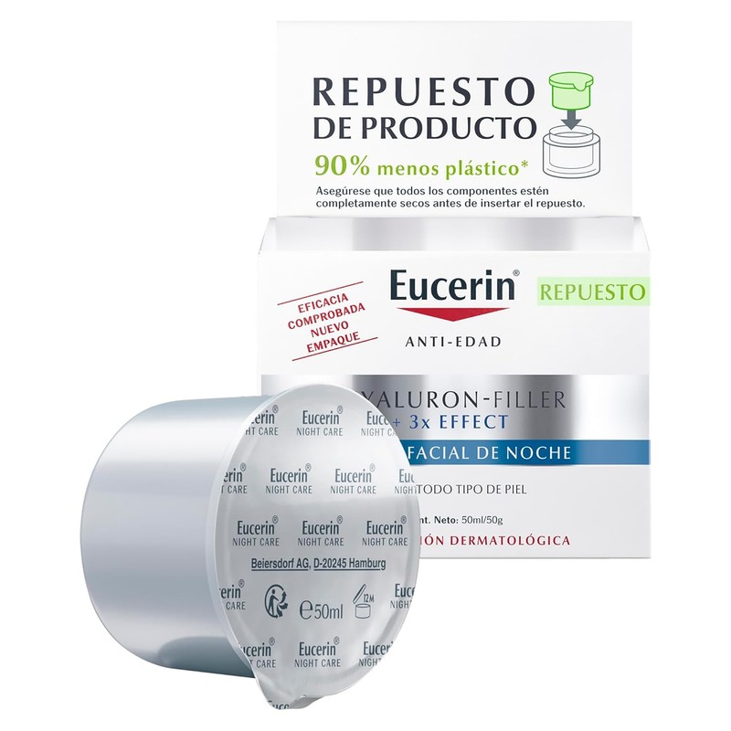 - Filler 3x Effect Crema de Noche aborda los primeros signos de envejecimiento. Ayuda a rellenar notablemente las líneas finas e incluso las arrugas profundas para conseguir un aspecto rejuvenecido, mientras favorece el proceso natural de reparación de la piel, La mezcla única de Eucerin de Ácido Hialurónico de alto y bajo peso molecular, Glicina Saponina y Enoxolona, ofrece un enfoque específico para ayudar a rellenar visiblemente incluso las arrugas profundas. El Ácido Hialurónico de alto peso molecular mejora la hidratación y suaviza las capas más externas de la piel, mientras que el Ácido Hialurónico de bajo peso molecular, que es 40 veces más pequeño1, penetra más en las capas epidérmicas de la piel, donde se originan las arrugas profundas. El antioxidante Glicina Saponina, favorece la producción de Ácido Hialurónico en la capa dérmica, donde se forman las arrugas profundas, y protege de los radicales libres. La Enoxolona protege de la degradación al Ácido Hialurónico propio de la piel y el Dexpantenol apoya el proceso de regeneración de la piel durante la noche. Modo de Uso: Aplicar por la noche sobre el rostro, el cuello y el escote bien limpios. Masajear suavemente la piel. Evitar el contacto con los ojos. Para obtener los mejores resultados, utilizar en combinación con Eucerin Hyaluron