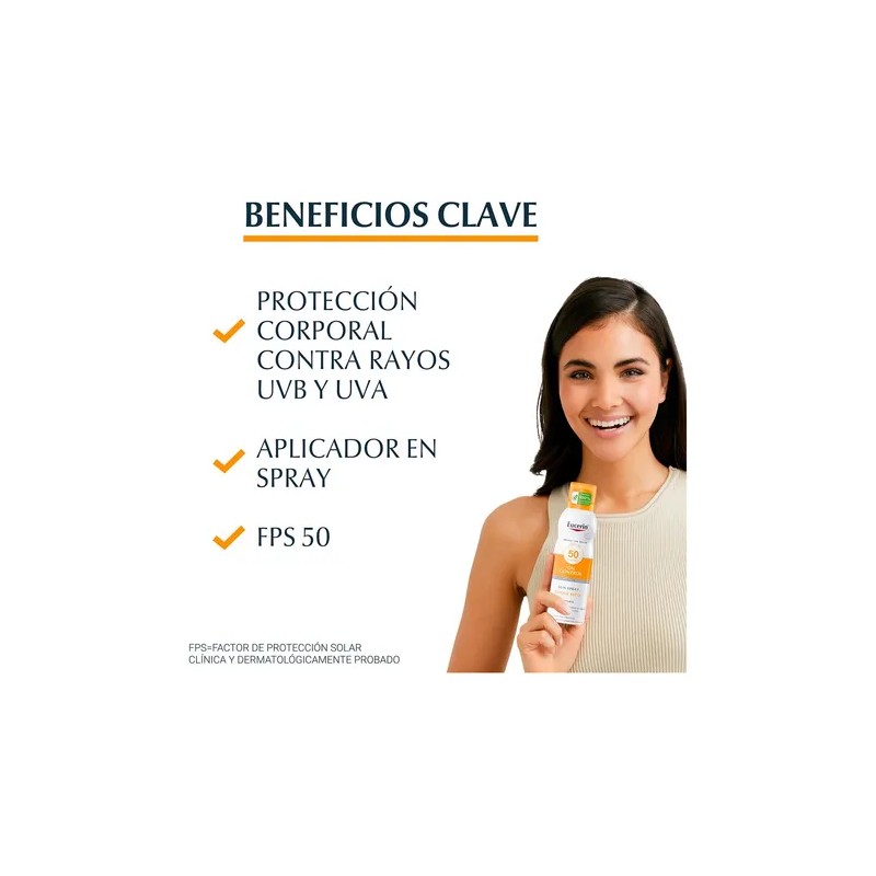 Eucerin Sun Spray Transparente Sensitive Protect Toque Seco FPS 50 es un protector solar en spray para el cuerpo, adecuado para la piel sensible y también para piel con imperfecciones. La luz UV es la principal causante del daño solar.