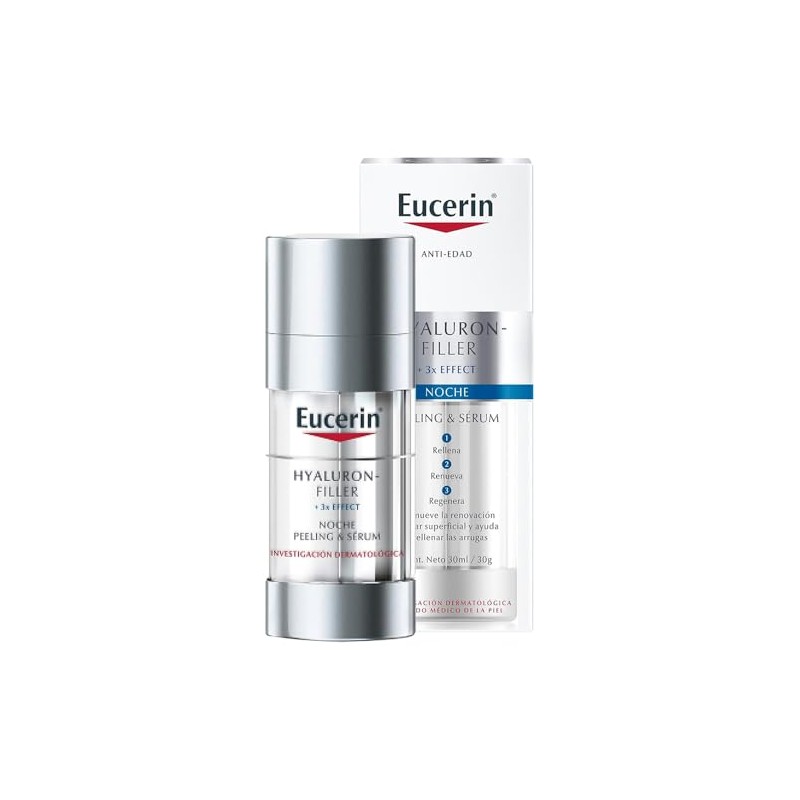 - Filler + 3x Effect Peeling & Serum Noche, Sérum nocturno con efecto peeling de doble acción, Hyaluron Filler de Eucerin. Este suero promueve la regeneración celular, exfolia y mejora la textura de la piel y rellena las arrugas gracias a su fórmula con Ácido Hialurónico y AHA Complex. Las rutinas de ácido hialurónico y el peeling en la piel se encuentran dentro de métodos anti