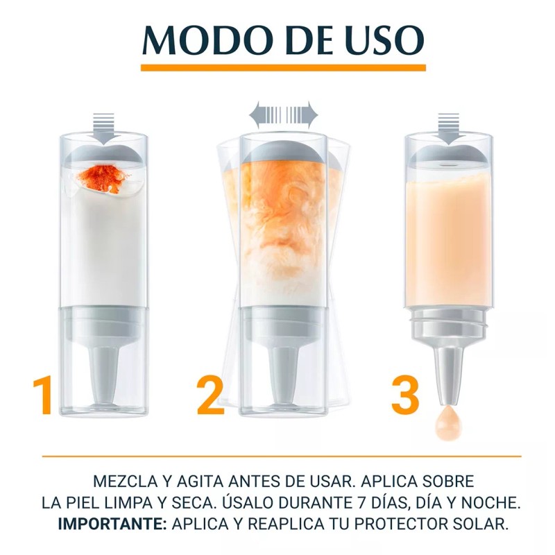 Modo de Uso: Retira la lámina de aluminio de protección, pero deja el tapón puesto. Presiona el botón inferior 2 o 3 veces para liberar la vitamina C. Agita el dispensador durante al menos 10 segundos para activar la fórmula. Limpia la piel minuciosamente con Eucerin DermatoCLEAN Agua Limpiadora Micelar 3 en 1 (para todo tipo de pieles). Aplica el sérum facial anti-edad con Vitamina C. Puedes usarlo por la mañana o por la noche. Se debe aplicar antes de tu crema de día o de noche, o bien combinarlo con tu crema hidratante o crema de tratamiento antes de aplicarlas.