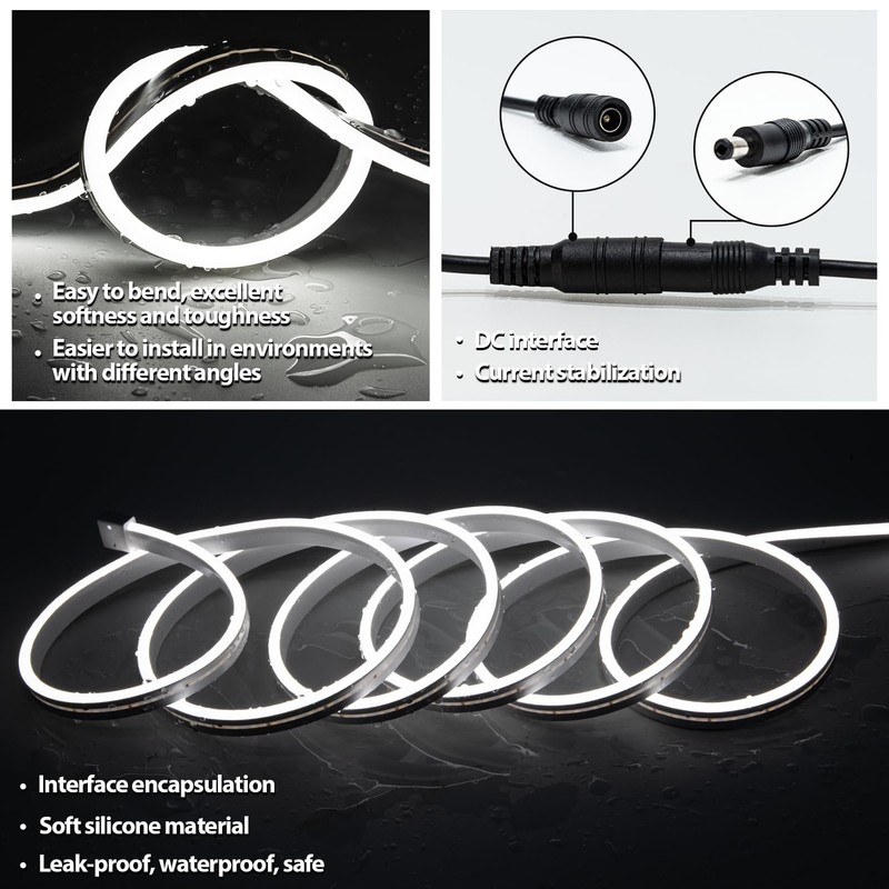 - Flexible & Waterproof: Compared to normal LED strips,this neon LED light strip are more flexible and you could easliy bend it for shapes you want. It can easliy adapt to kinds of cornners. Covered by silicone wrap,it's IP65 waterproof and sutable for indoors and outdoors usage.