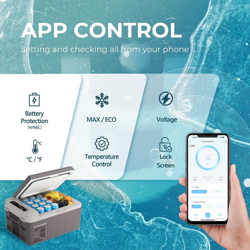 - Powerful Compressor & APP Control:This compact and portable 12V cooler combines convenience and performance with its spacious 11 quart capacity, functioning seamlessly as both a fridge and freezer. Powered by an advanced compressor, it rapidly cools from 68°F to 32°F in just 15 minutes, ensuring your food and drinks stay fresh and chilled. Enhanced with Bluetooth connectivity and app control, this portable freezer allows you to effortlessly monitor and adjust settings remotely.