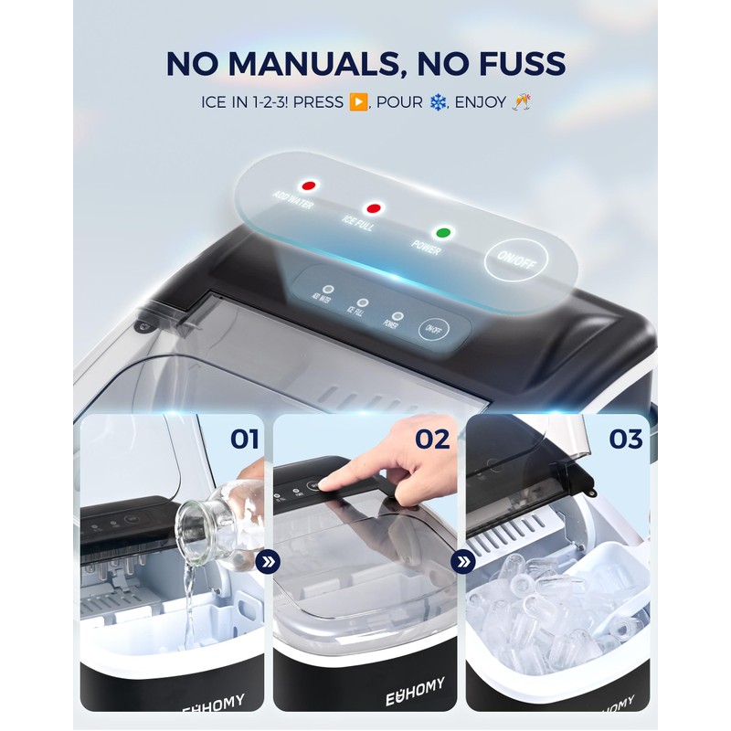 - User Friendly & Simple Operation: Euhomy ice maker is a popular and classic model of the moment adopts large see-through window visualized, allowing viewing of the interior ice-making. Equipped with a 170w upgraded compressor that 4kWh/24H energy consumption to save your electricity bills. And with a easy-to-operate controlable panel for faster operation in just two steps, adding water and press "ON/OFF". Then our ice maker will provide you fresh bullet ice for you and your member timely.