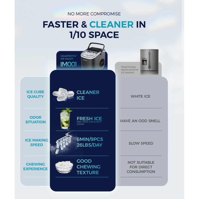 - 6 Mins Ice-Making & Ultra Quieter: Our Euhomy ice maker only takes 6mins that will enjoy the first batch of fresh bullet ice. With a 1.2L water tank and powerful compressor, the portable ice maker easily makes maximum ice capacity to 26lbs ice per day and holds up to 1.3lbs ice at a time. Also, our ice maker is not only excellent in refrigeration, but also at less than 45db normal noise, ensuring a comfortable and quiet environment to enjoy ice-making, similar to a working freezer.