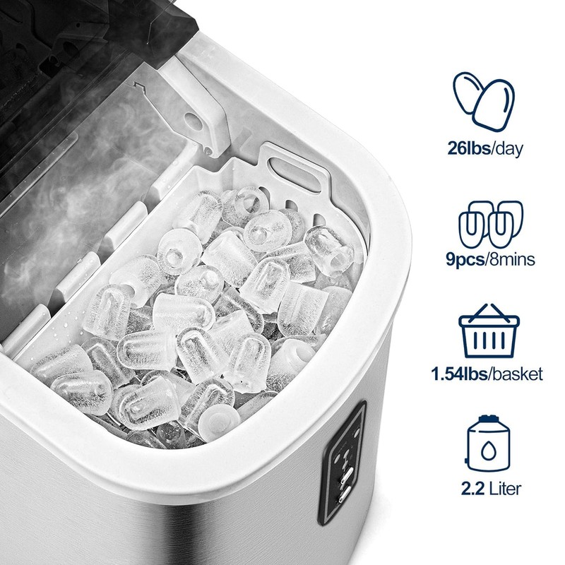 - Euhomy - GIVE YOU THE BEST ICE - Have you experienced a new type of bullet ice cube? Euhomy's newly designed bullet-type countertop ice maker machine brings you a brand new ice cube experience. Ice machine countertop can produce about 26 lbs of ice per day. Only 8 minutes can produce 9 pcs delicious ice cubes, you can do it anytime you want. Chewable ice cubes are perfect for Drinks/Food/Seafood/Smoothies.
