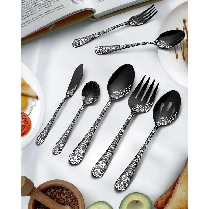 - 【Comfortable Grip and Ergonomic Design】This black serving utensils set stainless steel is engraved with a unique laser engraved flower pattern.Distinctive design with smooth edges of black large serving spoon and fork.Elegant and stylish design handle, make your tableware stand out. The handle design is even more attentive, with ergonomic crafted handle grip, making this serving utensils set more comfortable to use!