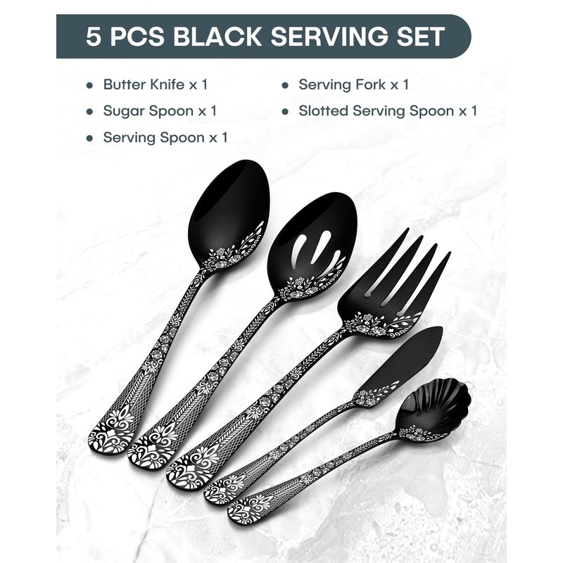 - 【5 PCS Serving Utensils Set】In this pretty black serving utensils set you will get 1 serving spoons, 1 slotted serving spoons, 1 serving forks, 1 butter knife and 1 sugar spoon. Large stainless steel flatware serving set for parties will perfectly satisfy your daily demands in serving, cooking, baking, filtering.