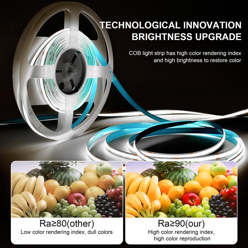 - 【Upgraded Brightness – 324 LED Chips for Seamless Lighting】Equipped with 324 ultra-dense COB LED chips, this 16.5ft (5m) strip delivers smooth, dot-free lighting. The 6500K daylight white provides a clean, natural tone that’s ideal for workspaces, mirrors, or minimalist décor. 90+ CRI enhances true color visibility and reduces glare.
