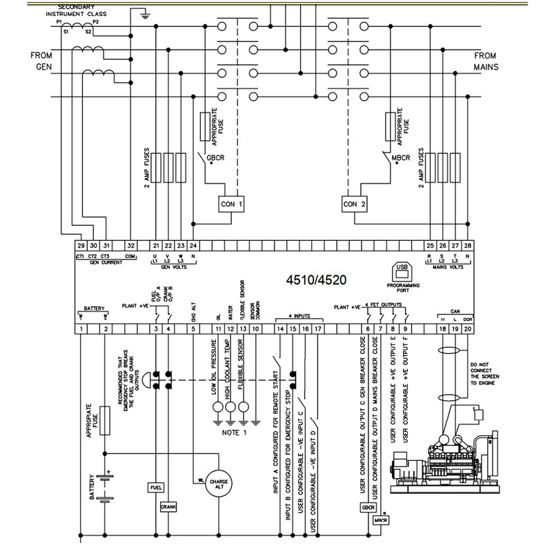 The generator engine controller module automatic start control unit 4520 has the function of an automatic mains (utility) fault control module, which can monitor the incoming mains (utility) power and indicate that the generator set is not available on the mains (utility) time to start. All modules include a series of intelligent control, monitoring and protection functions for standard and electronic engine generator set applications