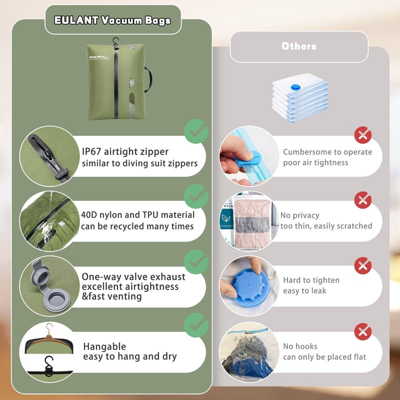 - Purchase instructions: these reusable EULANT compression vacuum bags have been specially designed for those who often travel long distances or are on business trips. Because they need to compress their luggage as small as possible in a backpack or suitcase to save as much space as possible, the bags are not made very large. If you buy them for home use, please check the size first.