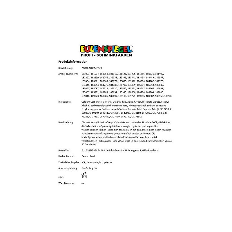 Mit der Profi-Aqua Schminke, in der Farbe Sonnengelb, können Sie Ihrer Kreativität freien Lauf lassen. Gestalten Sie die verschiedensten Schminkgesichter von Tiermasken, Bienen, Schmetterlingen, Hippies und vielem mehr. Sie erhalten 20 ml in einer wiederverschließbaren Dose. Die Farbe, auf Wasserbasis, reicht für ca. 50 Gesichter oder eineinhalb Körper. Sie ist wischfest und schnell trocknend. Ideal für Halloween, Karneval oder sonstige Veranstaltungen. So funktionierts: Mit feuchtem Pinsel oder Schwämmchen anlösen und auftragen. Um deckende Ergebnisse zu erhalten, mit dem Schwämmchen auftupfen und für transparente Applikationen, mit dem Schwämmchen die Farbe auf schraffieren. Mit Wasser und Seife kinderleicht zu entfernen. Weitere Schminkfarben, -Sets und Zubehör finden Sie in unserem Marken Shop. Klicken Sie dazu auf den Markennamen Eulenspiegel unterhalb des Produkttitels.