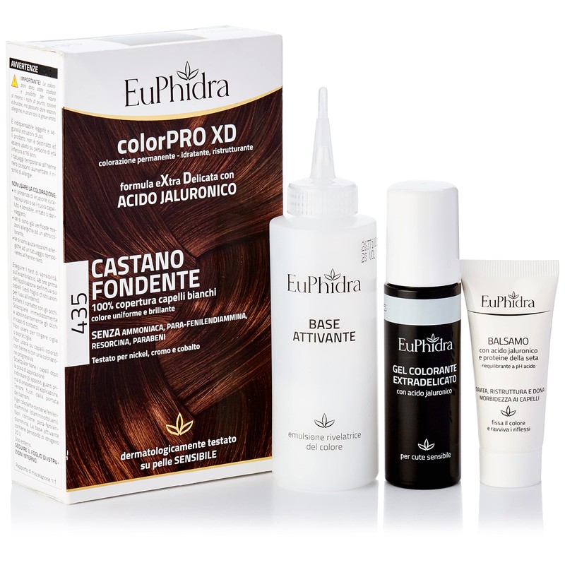 EuPhidra ColorPRO XD 435 Chestnut Fondant - With Low Molecular Weight Hyaluronic Acid, Steps in the deep structure of the hair, Increase Hydration, Volume, Shine, Suppleness. No para-fenilendiammina. No ammonia, resorcina, parabens, silicones. Colour full and shiny. Hold and long durability of the colour. Reproducibility of tone and reflections. Perfect coverage and homogeneous of white hair. Balm with silk proteins: protects and repairs the hair.