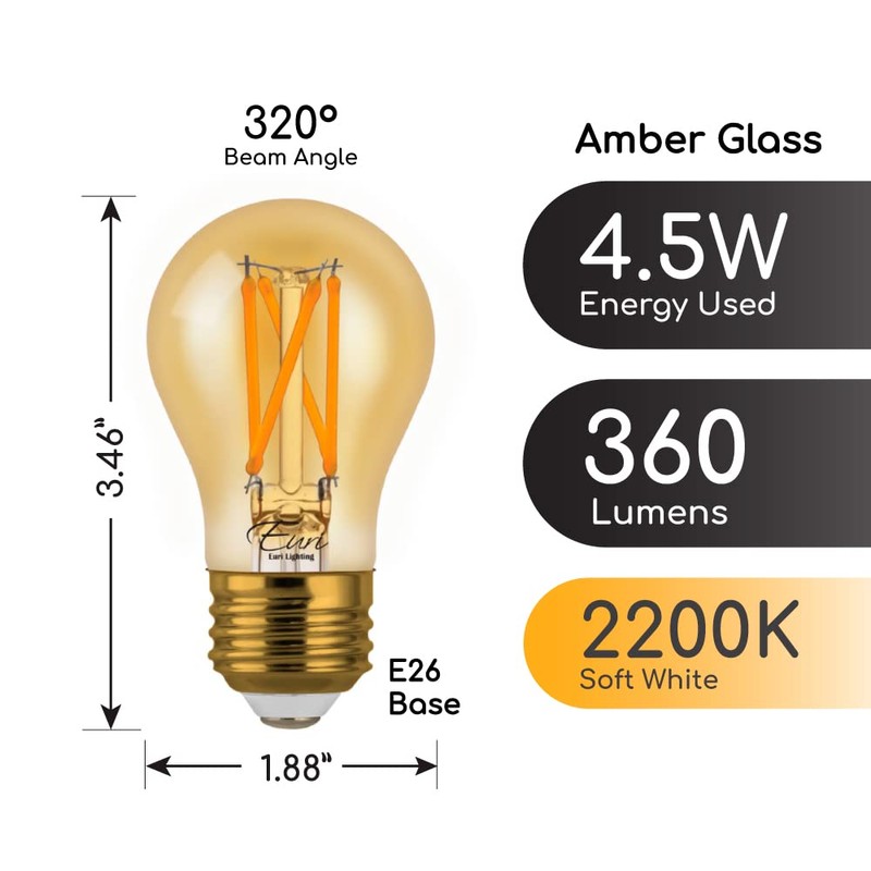 Euri Lighting VA15-3020ea-4 Dimmable LED A15, 4.5W (25W Equiv.) 360lm, 80 CRI, Amber Glass, Warm White (2200K), 320° Beam Angle, E26, Wet Rated, UL, E-Star 3YR 15K HR WTY, 4-Pack