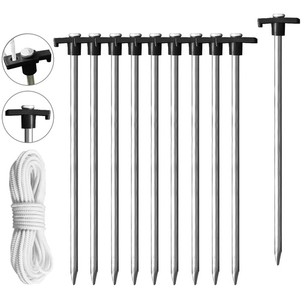 Eurmax USA Galvanized Non-Rust Camping Family Tent Pop Up Tent Stakes Ice Tools Heavy Duty 10pc-Pack, with 4x10ft Ropes & 1 Stopper(Black)