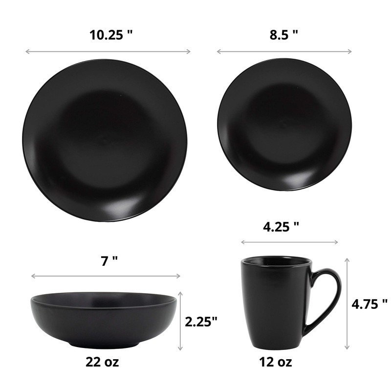 Euro Ceramica Euro Essential Collection 16 Piece Dinnerware Set, Service for 4, Solid Semi-Matte Black