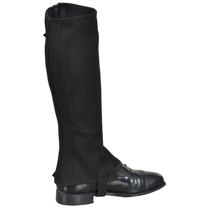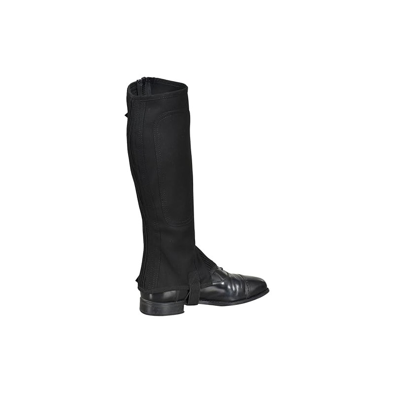 - Stretch-Resistant and Durable - More resistant to stretching than real leather, these synthetic leather half chaps will keep their shape very well. A reinforced elastic stirrup strap fits under your paddock boot for a snug fit, together with the durable YKK zipper and the contoured skirt which sits over your boot.
