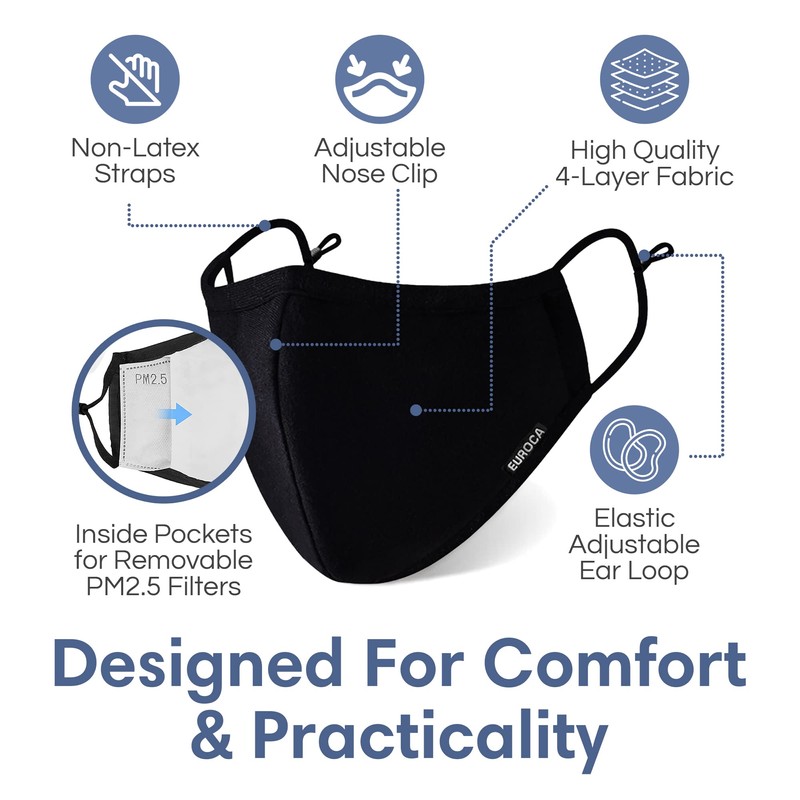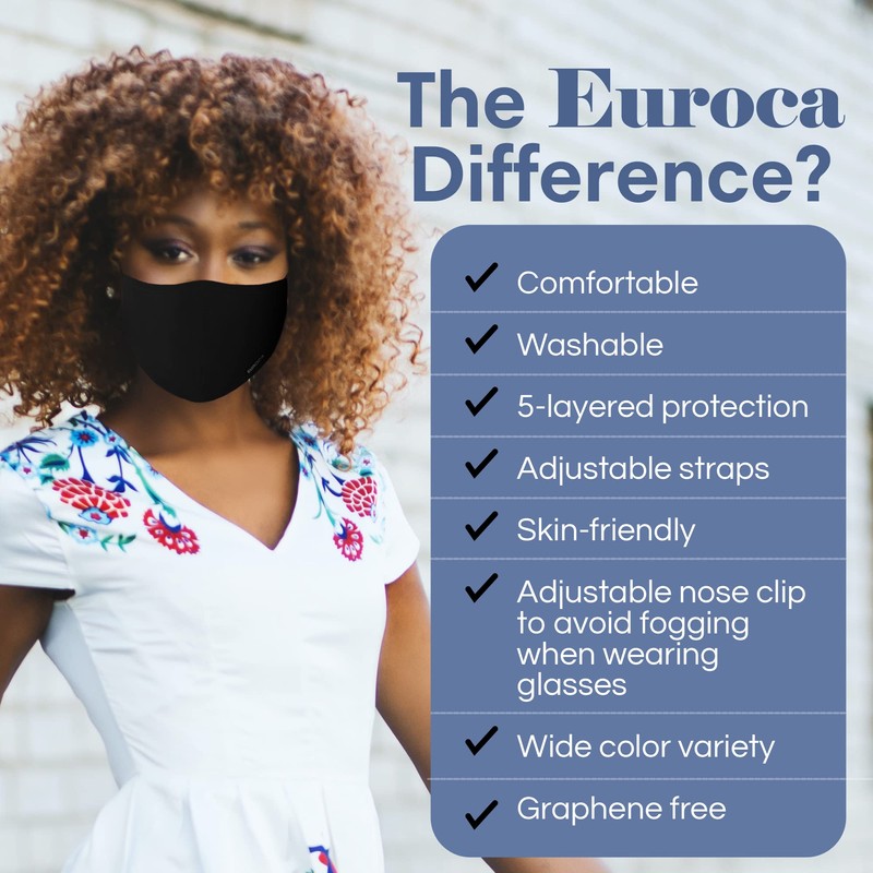 - Graphene-Free - Designed for your safety, Euroca’s reusable face mask uses a graphene-free activated carbon layer. And unlike usual disposable masks, our cotton face mask is skin-friendly and comfortable.