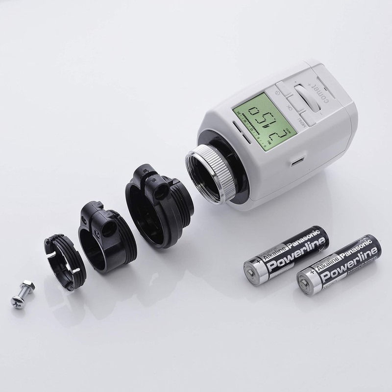 - Box contents: Comet Plus energy-saving controller, instruction manual DE (other languages on request), 3 adapters (Danfoss RA, RAV, RAVL), 2 x AA Mignon batteries, dimensions: 65 x 54 x 85 mm, colour: white