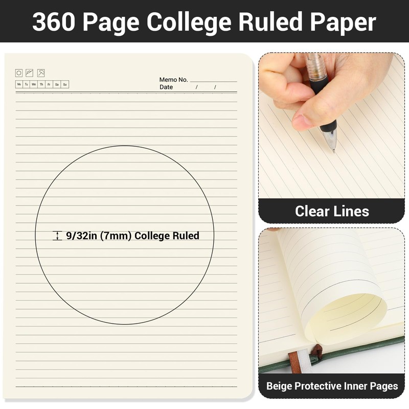 EUSOAR Work Notebook, 360 Pages Large A4 8.5" X 11" Thick Faux Leather College Ruled Lined Journal, 100gsm Thick Lined Paper, Campus Subject Work Office Business Notebook with Pocket Pen Holder-Green