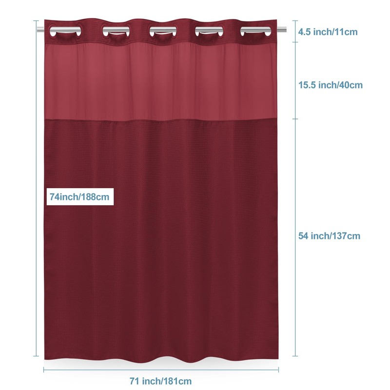 - 🚿【Dimensions】71W * 74H inch (180.5W * 188Hcm); Measures: 71" width by 74" length fits your standard sized bathroom, snap in liner is 54" x 70" (WxL). Package Included: 1 Shower curtain and 1 fabric snap-on replacement Liner,2 bottom magnets on both corners