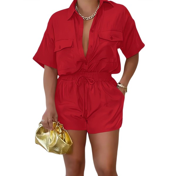 Euulin Women’s Two Piece Lounge Tracksuit Outfit Set Lightweight Button Down Shirt and Drawstring Casual Shorts Sets Red XL