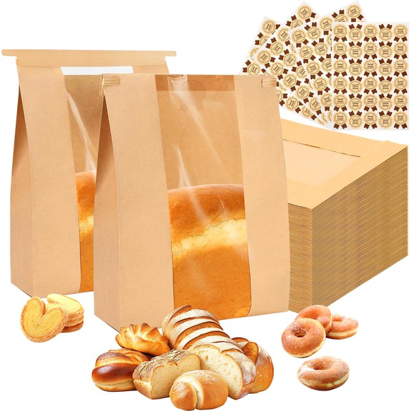 EUVBOKW 120 Pcs Bread Bags for Homemade Bread Sourdough,Large Kraft Paper Storage Bags with Window and Tin Tie Tab Lock,120 Sealing Stickers(13.7x8.3x3.7 In) (120)