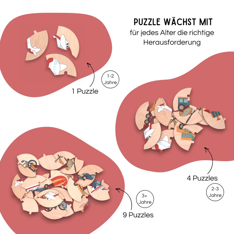- Playful learning with 9 exciting motifs: the set contains 9 lovingly designed wooden puzzles, each 3 pieces, for a total of 27 pieces. Perfect for playfully promoting fine motor skills, logic and patience