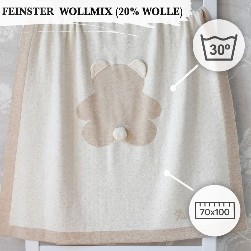 This cuddly soft knitted blanket with 3D teddy print is a must for any baby equipment. Whether in the bassinet, in the baby bed or the cradle – the wool blanket will become the favourite companion of your little treasure from birth and until school.